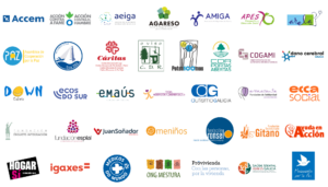 Nuestra Red está formada por entidades como Accem, Acción contra el Hambre, Asamblea de Cooperación por la Paz, AGARESO (Asociación Galega de Comunicación para o Cambio Social), Arela, Asociación de Empresas de Inserción de Galicia – AEIGA, Asociación de Migrantes de Galicia – AMIGA, Asociación para la prevención y la educación social – APES, Ayuda en Acción, Federación Autismo Galicia, Buena Vida Inclusión Activa, Cáritas Lugo, Cáritas Mondoñedo-Ferrol, Cáritas Ourense, Cáritas Tui-Vigo, CDR O Viso, CDR Portas Abertas, COGAMI, Dano Cerebral Galicia, Down Galicia, Fundación ECCA Social, Ecos do Sur, Emaús Galicia, Fundación Amaranta, Fundación Érguete Integración, Fundación Esplai, Federación Alzheimer Galicia – FAGAL, Hogar Si, Fundación Juan Soñador, Fundación Meniños ,Fundación Ronsel, Fundación Secretariado Gitano, Igaxes, Médicos del Mundo, Movimiento por la Paz, el Desarme y la Libertad (MPDL), ONG Mestura, Poten100mos, Provivienda y Salud Mental FEAFES.