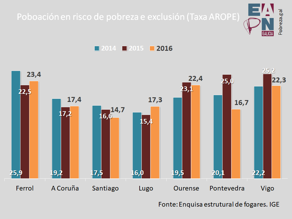 Nas 7 cidades, la tasa de riesgo de pobreza o exclusión social, segundo o IGE, foi a seguinte: