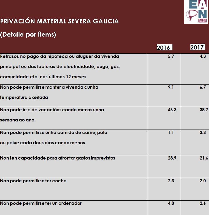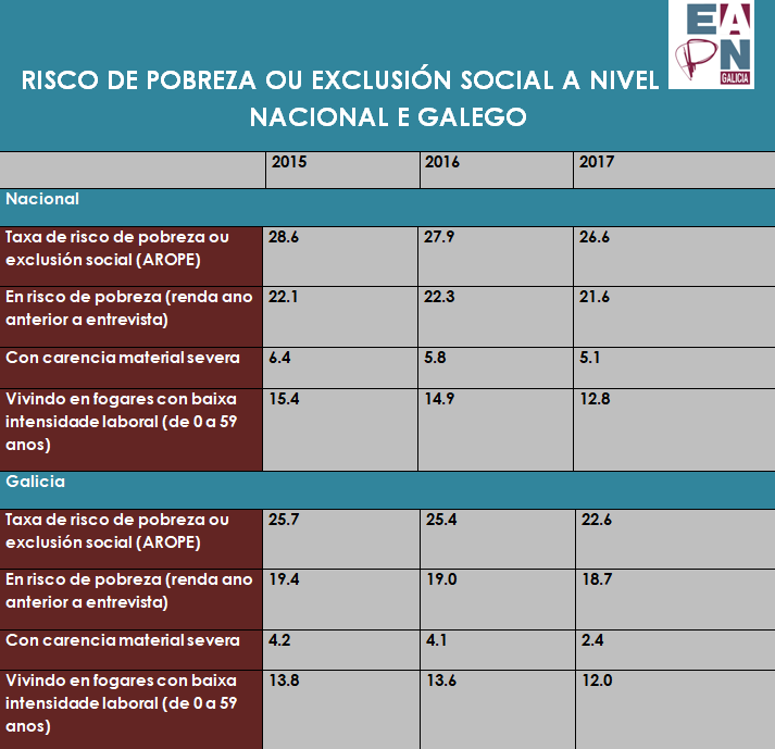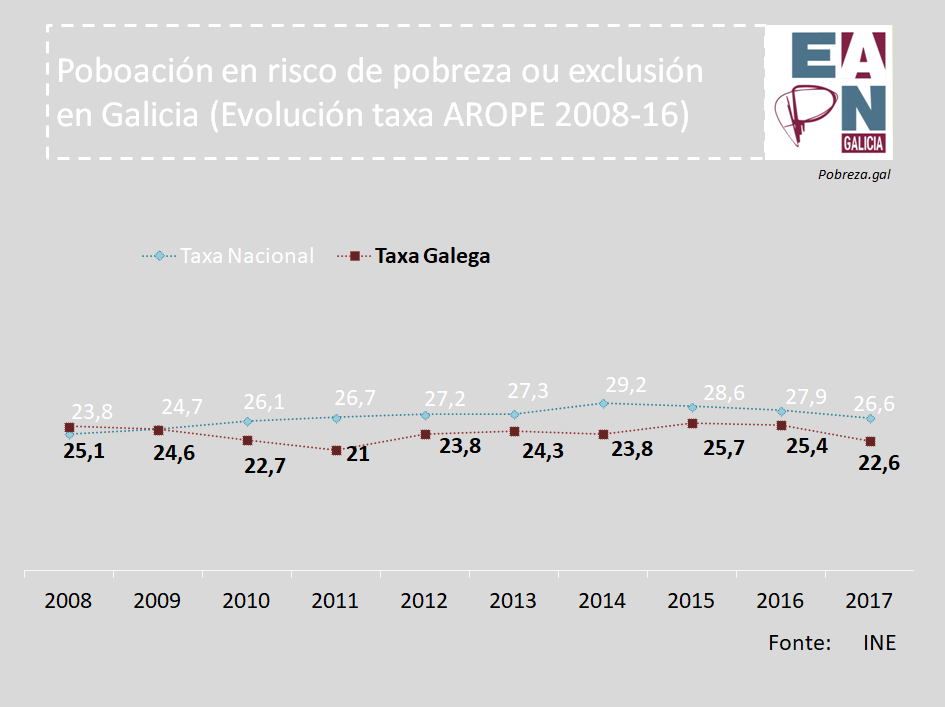 El recientemente publicado Enquisa de Condicións de Vida 2017 (ECV) publicada polo Instituto Nacional de Estatística (INE) trae algúns datos positivos en Galicia, pola baixada de todos os indicadores, ainda que a redución é lenta comparada co crecemento da economía e o temor fundado a que nunha nova crise económica a pobreza de moitas persoas voltaría a empiorar rápidamente. La porcentaje de la población en riesgo de pobreza o exclusión (AROPE) baixou do 25,4% en el 2016 hacia 22.6% en el 2017. 75.000 menos gente (de 690.000 la 614.000).
