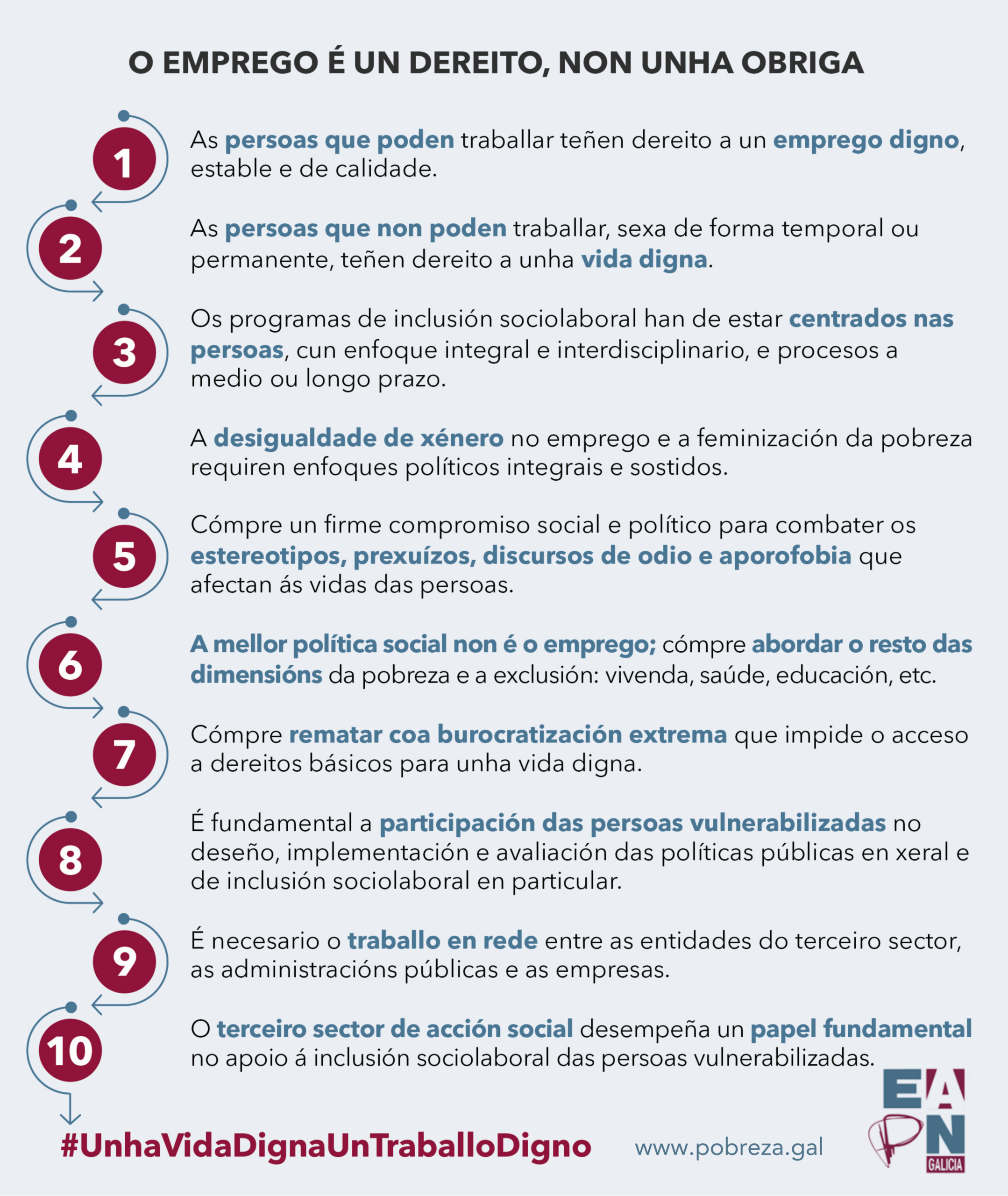 en la banda de propuestas politicas, «pagresentamos claves de mejora de las políticas públicas para que estos programas puedan ser efectivos. Incluso as resumimos no Decálogo titulado“El empleo es un derecho, no es una obligación" informa a presidenta de EAPN Galicia.