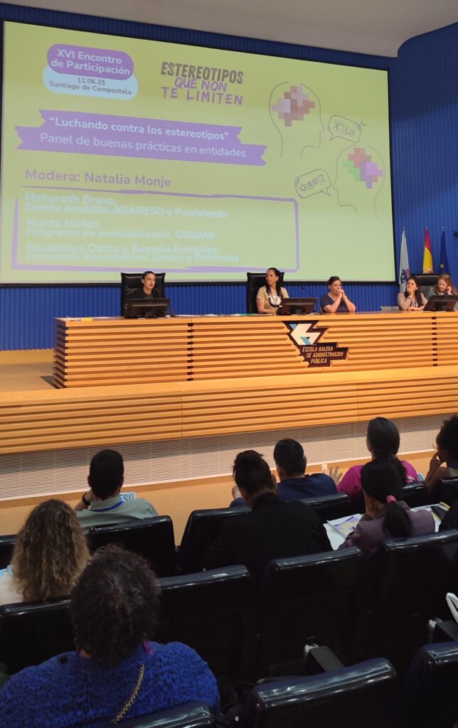 O punto esperanzador e inspirador do Encontro correu a conta de participantes de programas de entidades que loitan para derribar estes prexuízos. O Panel de boas prácticas en entidades estivo composto por Mahyreth Bravo co proxecto Somos Acubillo de AGARESO e Provivienda, Marta Núñez co Programa de sensibilización de COGAMI e Rosebys Ostos e Begoña González contando os Encontros Improbables, dentro do Programa Participa de Emaús e Provivienda. A mesa estivo moderada por Natalia Monje de Ecos do Sur.