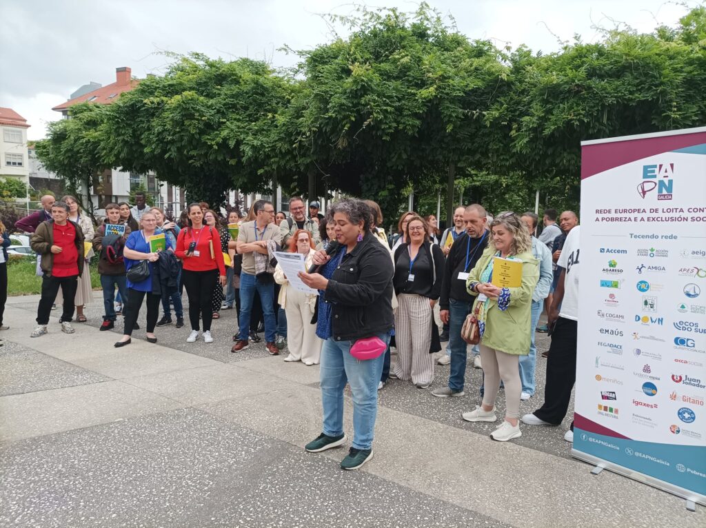 “A violencia administrativa —termo acuñado polas propias persoas afectadas— é lamentablemente un feito que ten que desaparecer. A excesiva burocracia, a fenda dixital ou a falta de equidade no acceso á información, son factores que contribúen a aumentar a desigualdade social. Por iso este ano, e como xa se fixo no Encontro Estatal de Participación quérovos pedir un minuto de silencio, un minuto de silencio administrativo, en protesta polas continuas trabas administrativas e burocráticas que sofren as persoas en pobreza e exclusión”. Palabras pronunciadas por Tsion Piñeiro, técnica de Dano Cerebral Galicia antes do minuto de silencio.