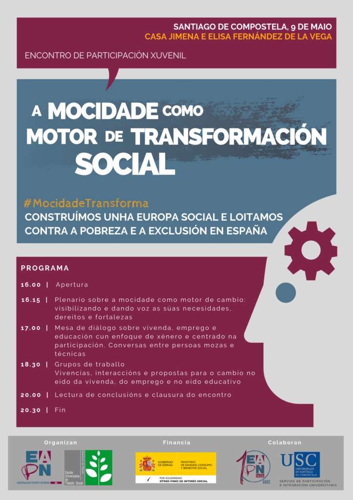 O 9 de maio, celebrouse en Santiago de Compostela “A mocidade como motor de transformación social “. Un encontro de participación para dar voz aos mozos e mozas organizado polo alumnado da Escola Universitaria de Traballo Social da USC e EAPN-España e coa colaboración do Servicio de Participación e Integración Universitaria da USC.