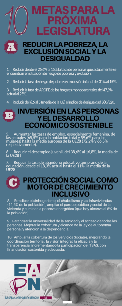 Coa nova convocatoria de eleccións xerais para o vindeiro 10 de novembro, dende EAPN-España e as redes autonómicas como EAPN Galicia que formamos parte da mesma, quérese trasladar a tódolos partidos as propostas políticas e sociais contra a pobreza e a exclusión. Para iso preséntase o decálogo ‘10 Metas para la próxima legislatura’ que inclúe unha serie de propostas sociais cun obxectivo claro e común: conseguir un Pacto entre os partidos políticos do arco parlamentario, ao fin de facer efectivo o dereito da poboación a unha vida digna, en paz e seguridade.
