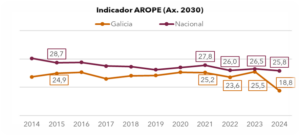 O XV informe “O Estado da Pobreza en Galicia 2025”, revela que no ano 2024 a pobreza e a exclusión social reduciuse 6,7 puntos, o que se traduce en case 180.000 persoas menos que no 2023.