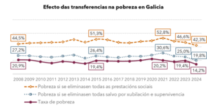 As administracións de ámbito estatal, autonómico e local xogan un papel clave na redución de pobreza coas súas políticas sociais e medidas de protección. De non existir ningunha transferencia pública (Estado, Xunta ou concellos) en Galicia, en 2024 a situación de pobreza chegaría ao 42,3% (aumentando un 197,6%, 28,1 puntos). Actualmente a taxa de pobreza é do 14,2%, é dicir, 384.000 persoas. De non existir ningunha transferencia ese número ampliaríase a máis de 1.144.000 persoas en total, o que suporía 760.000 persoas máis en risco de pobreza que a cifra actual.