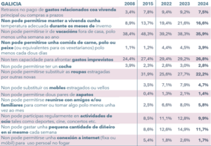 Todos os elementos que compoñen este indicador melloran. A pesares disto continúa a haber ítems que seguen manténdose elevados, como a taxa de persoas que non poden permitirse manter a vivenda a unha temperatura axeitada, pasou dun 21,6 % no 2023 ao 16,6% no 2024 ou a de persoas que non teñen capacidade para afrontar gastos imprevistos (que pasou dun 29,2% en 2023 a un 26,8% en 2024).
