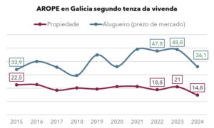 Segue a existir unha fenda importante entre as persoas que viven de alugueiro e as que viven en propiedade. Un 36,1% de persoas que viven de alugueiro están en risco de pobreza fronte a un 14,8% que viven en propiedade. Este dato dá conta da subida dos prezos dos alugueiros que afecta principalmente á poboación en pobreza e que dificulta aínda máis as dificultades de emancipación da mocidade e desenvolver o seu proxecto vital.
