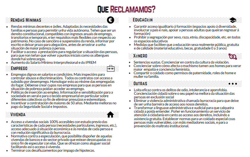 “E que pasa coas rendas mínimas? As persoas perceptoras, estamos moi cansas de ter que volver continuamente ao momento de partida, entrar en bucle e non poder saír desa situación por culpa de requisitos que non paran de dificultar o acceso ás prestacións”.
